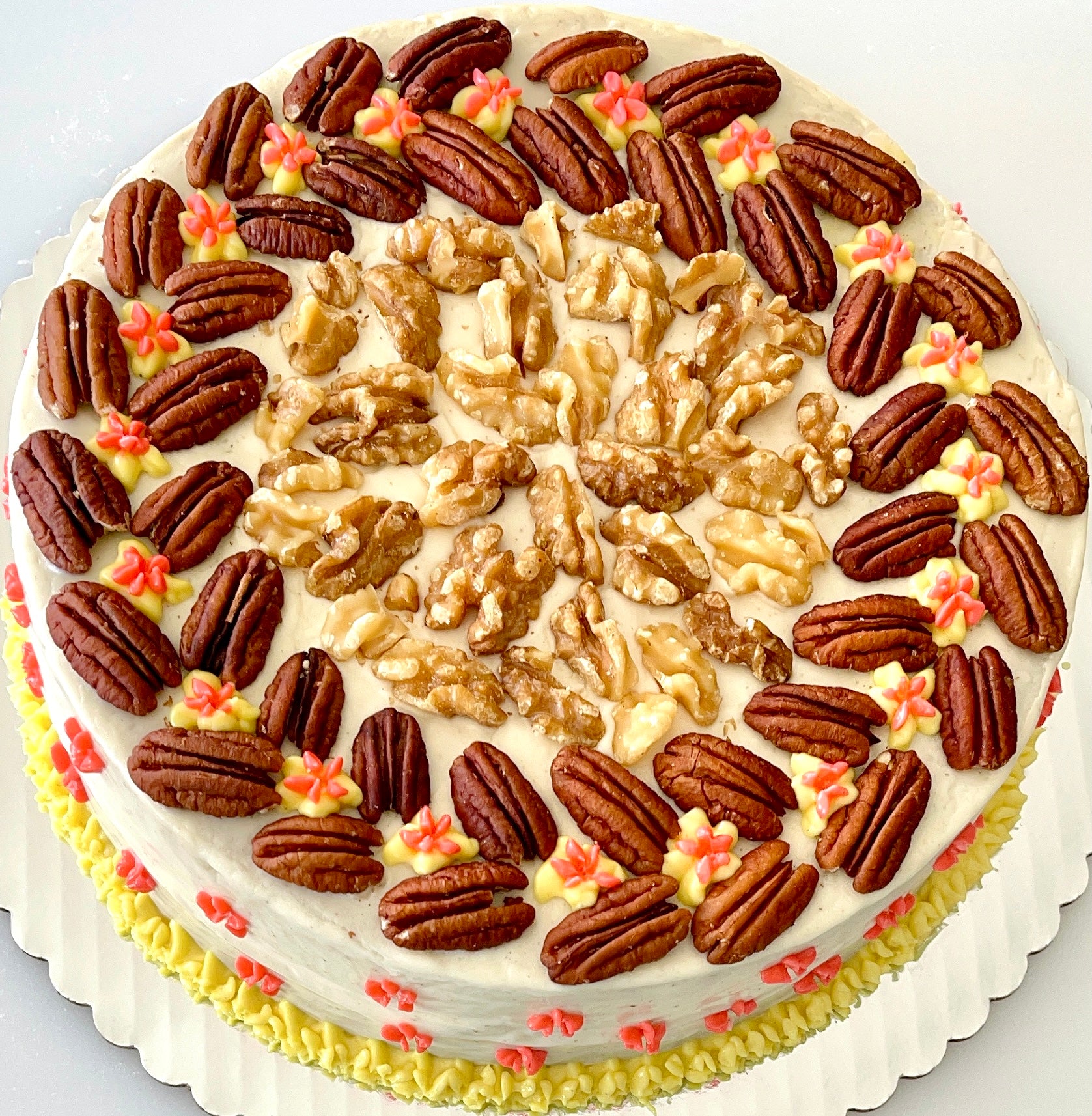 Enjoy our soft, moist Banana Cake with creamy buttercream frosting, packed with crunchy pecans and walnuts — the perfect treat for any occasion.